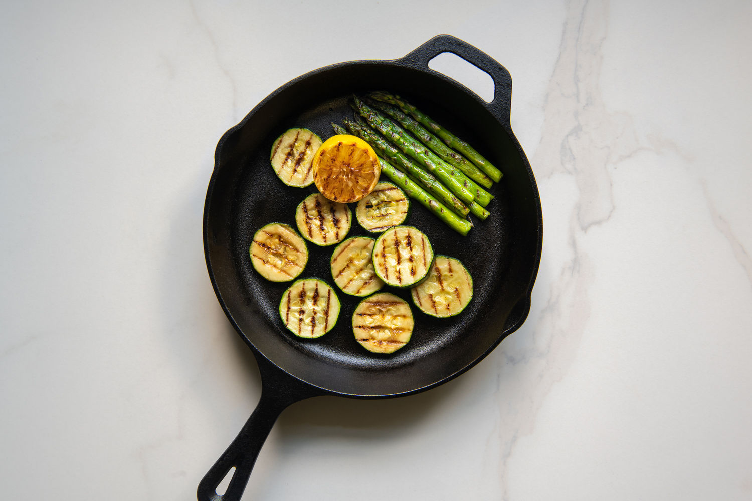 Meanwhile, heat a pan on a medium-high heat. Toss the asparagus and courgette with a drizzle of olive oil and some salt, before placing on the griddle. Cook for 4-5 minutes on each side until nicely charred. Add half the lemon to char for the final 2 minutes, cut side down.