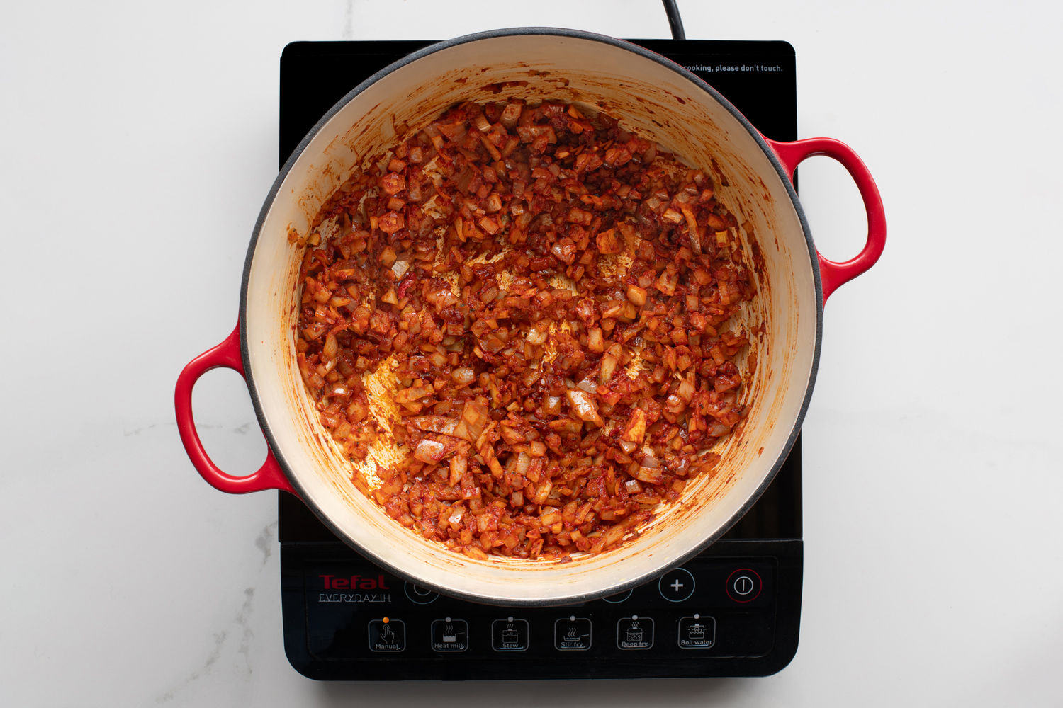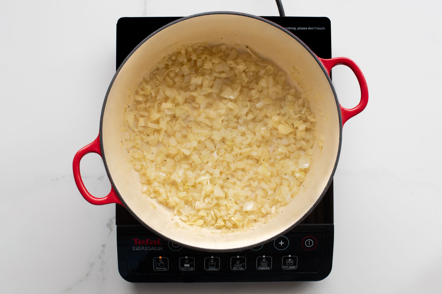 Heat the olive oil in a large heavy-bottomed saucepan. Add the onion and garlic with a light sprinkle of salt and pepper. Cook, stirring often, for 3-4 minutes, until softened.
