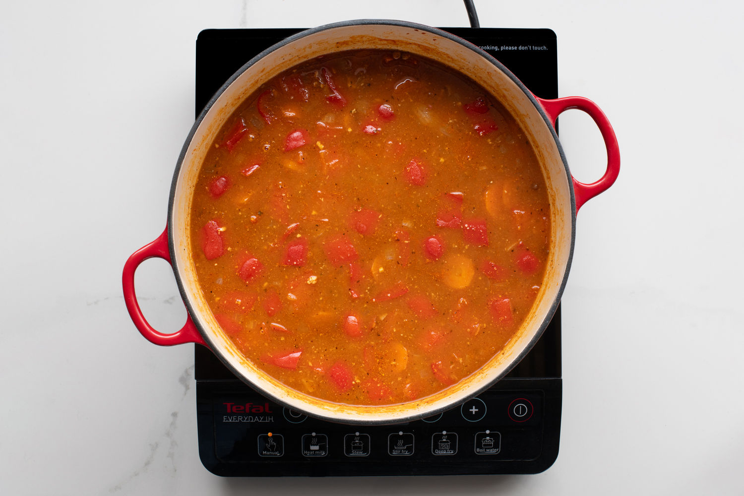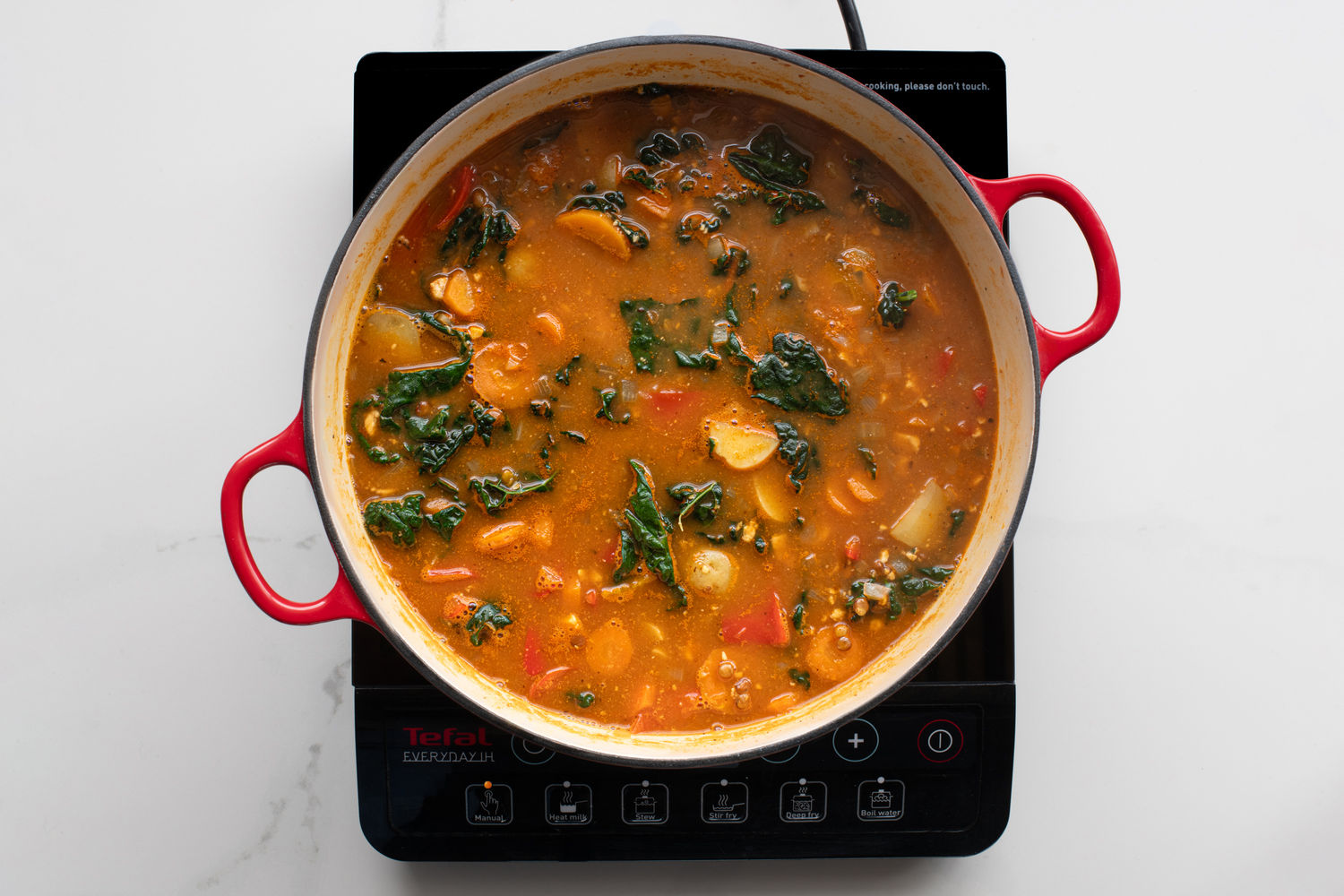 Add the lentils, potatoes, carrots, peppers and vegetable stock. Bring to a simmer and cook for 20-25 minutes, until tender.
