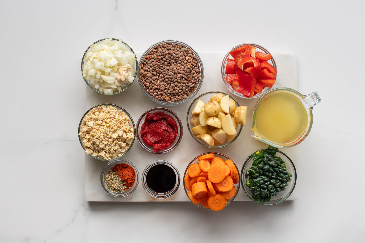 This stew is inspired by the Spanish dish lentils with chorizo. We have replaced the traditional chorizo sausage with spiced tempeh crumbles. Some bra...nds of tempeh can be easily crumbled - if you struggle, give it a rough chop and then pulse several times in a food processor. Doing this allows it to absorb maximum flavour from the rest of the dish. It also transforms the texture, so if you have a tempeh skeptic in your life, this might be a dish to convince them! Read more This stew is inspired by the Spanish dish lentils with chorizo. We have replaced the traditional chorizo sausage with spiced tempeh crumbles. Some brands of tempeh can be easily crumbled - if you struggle, give it a rough chop and then pulse several times in a food processor. Doing this allows it to absorb maximum flavour from the rest of the dish. It also transforms the texture, so if you have a tempeh skeptic in your life, this might be a dish to convince them!