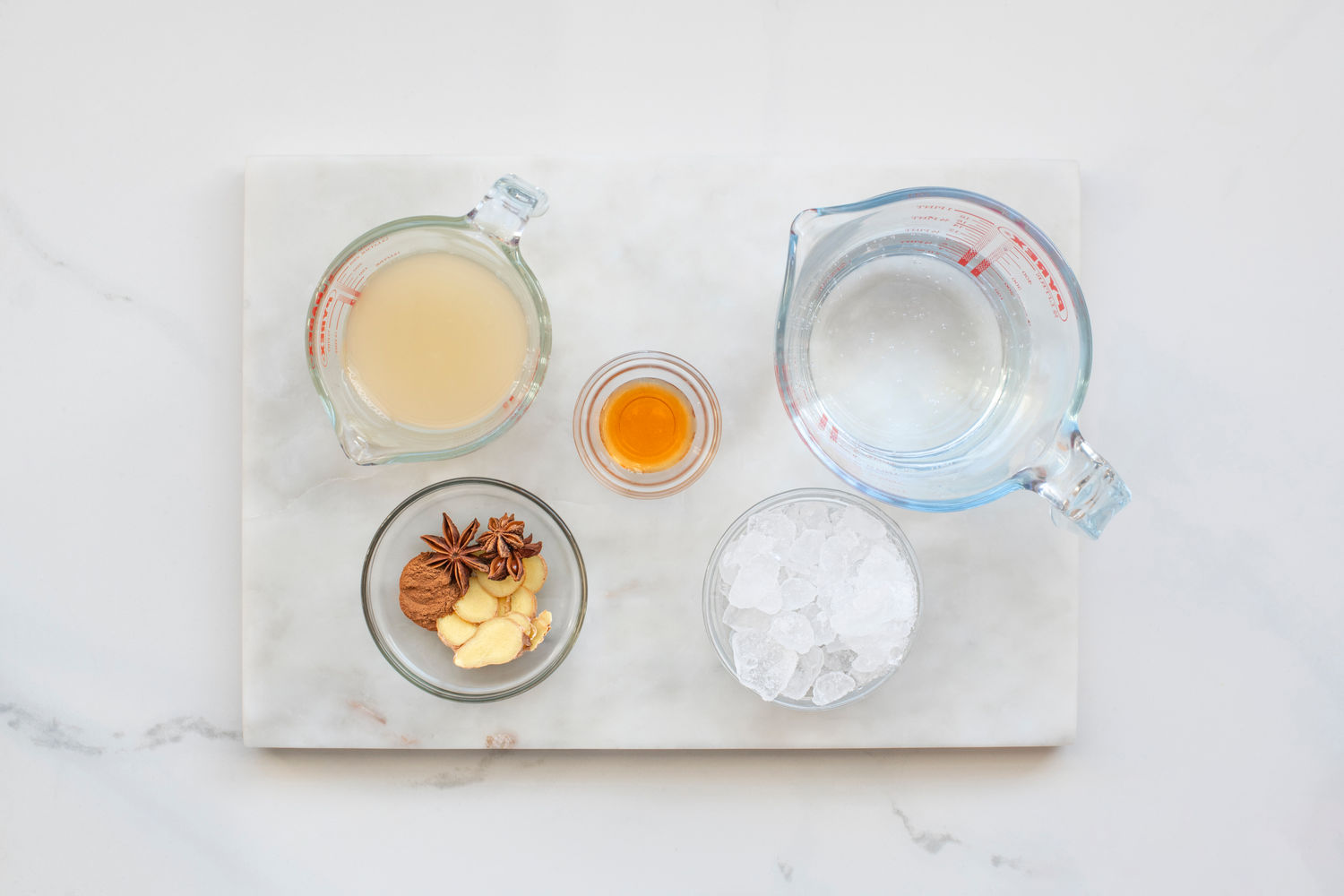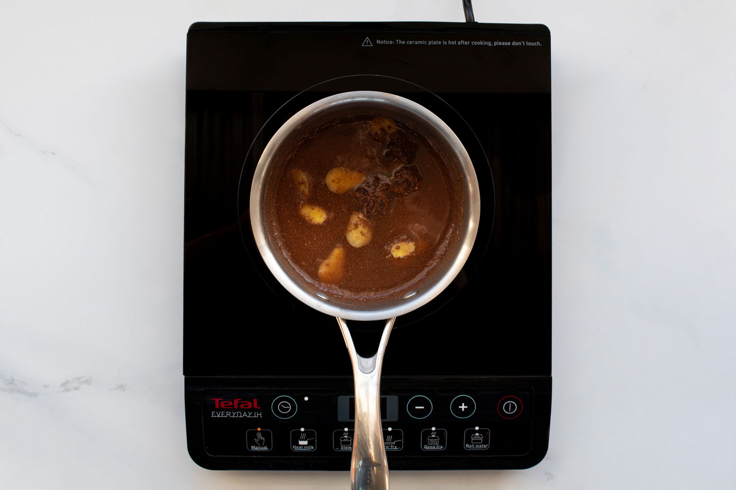 Place the apple juice, maple syrup, and spices into a saucepan over medium heat. Heat until nearly bubbling, then turn off the heat and allow to cool.