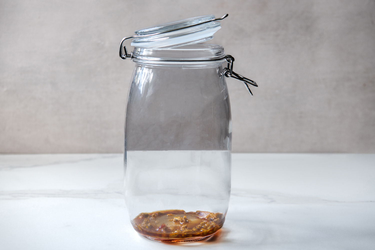 Mix the soy, vinegar, chilli oil, garlic and crumbled stock cube together in a 1 litre mason jar.