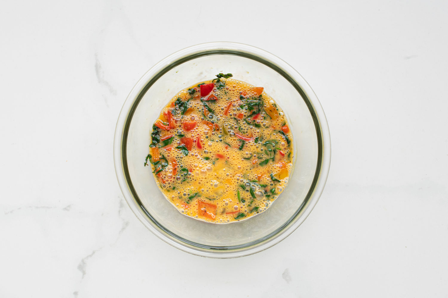 Crack the eggs into a bowl and whisk to combine. Add the cooled vegetables and stir to incorporate.