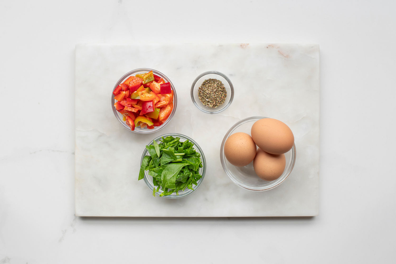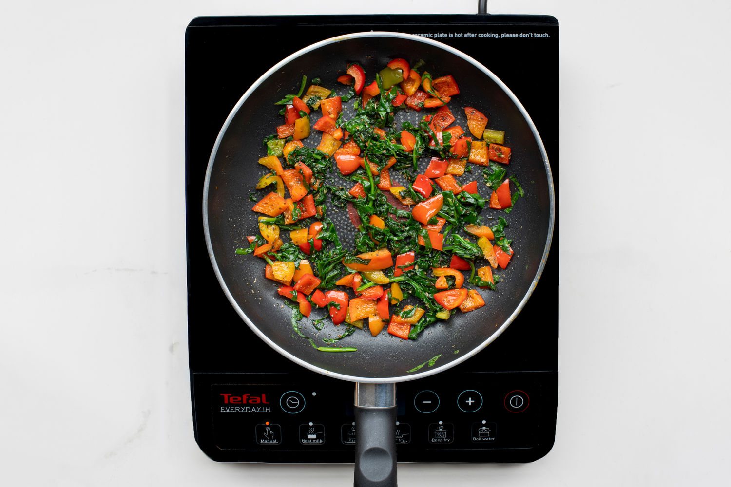 Heat a drizzle of olive oil in a frying pan over medium heat. Add the pepper and cook for 7-8 minutes, until softened. Then add the spinach and cook for a further 3-4 minutes, until wilted. Stir through the oregano. Set aside and allow to cool slightly.