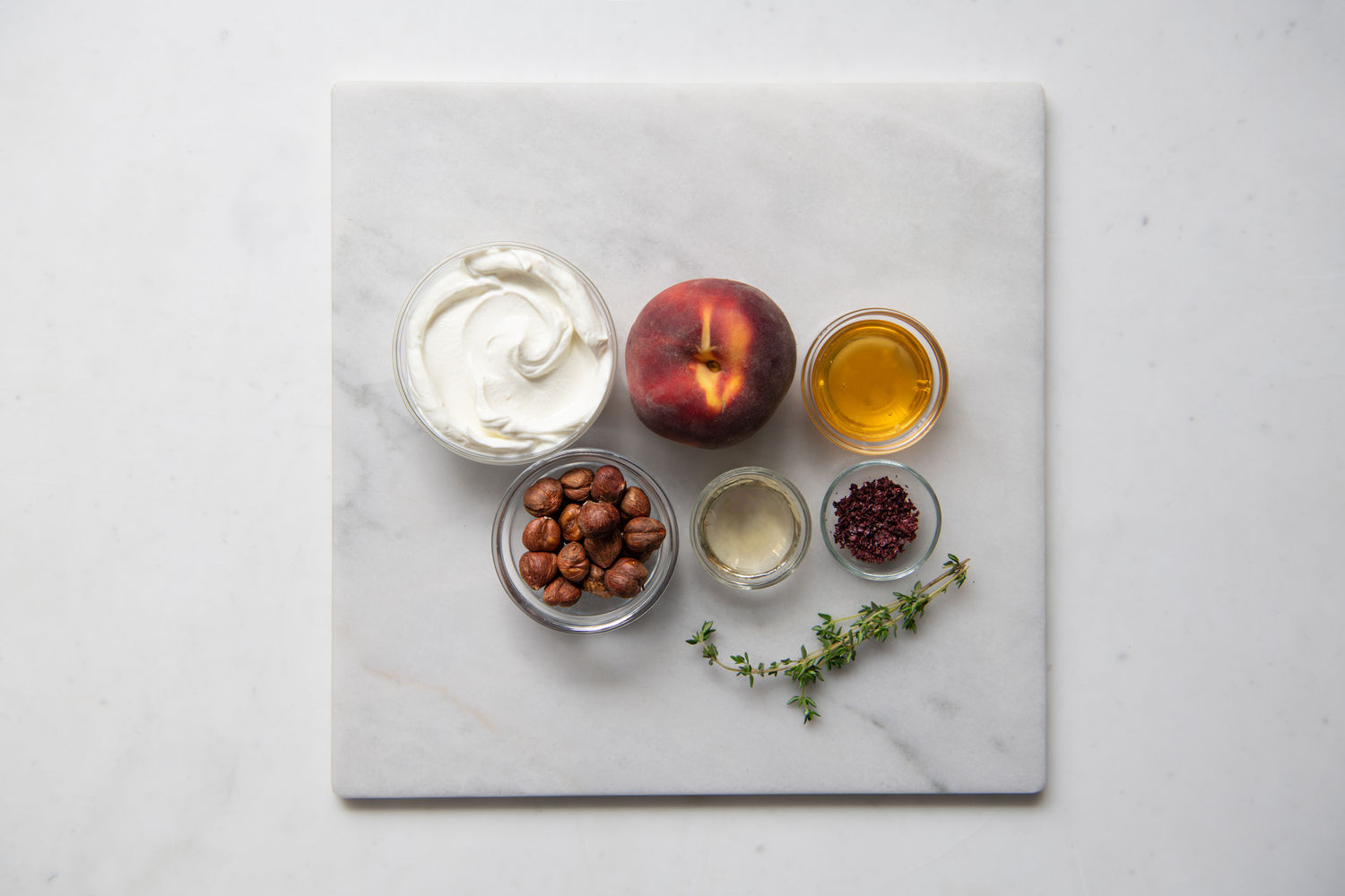 Thyme and Sumac Baked Peaches with Elderflower Yoghurt and Hazelnuts