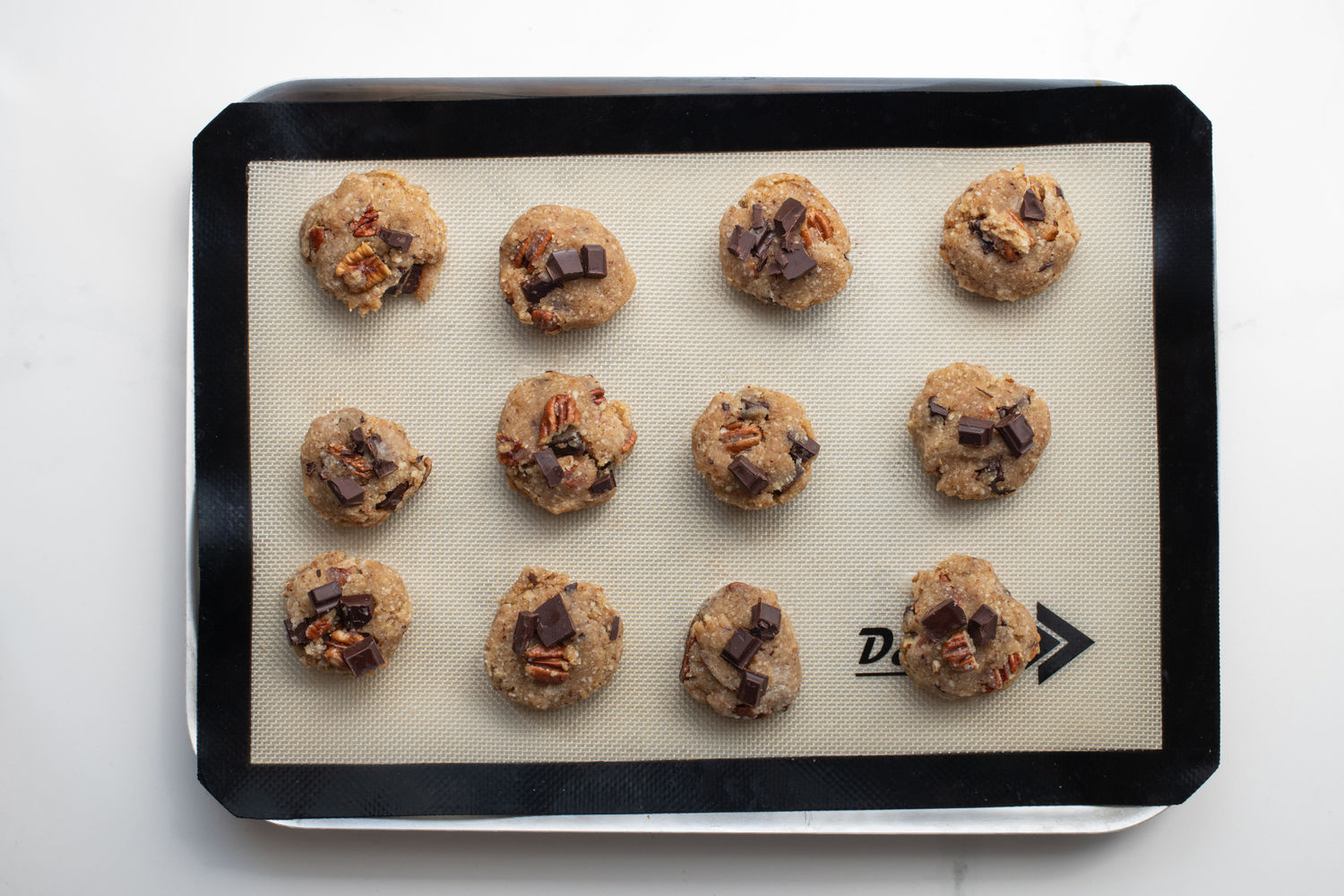 Shape into 12 balls. Flatten slightly and place onto your prepared baking tray. It helps to do this with wet hands.