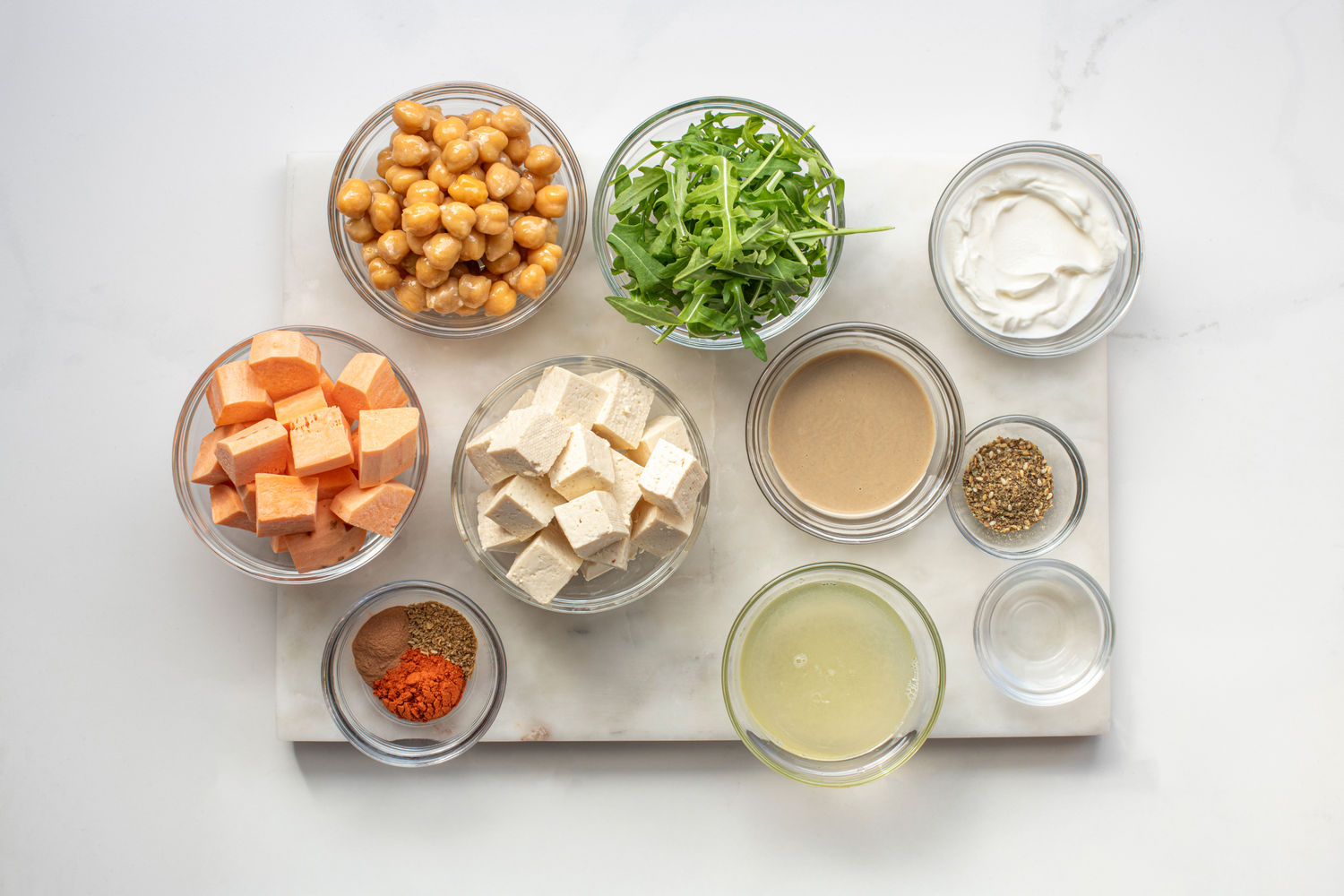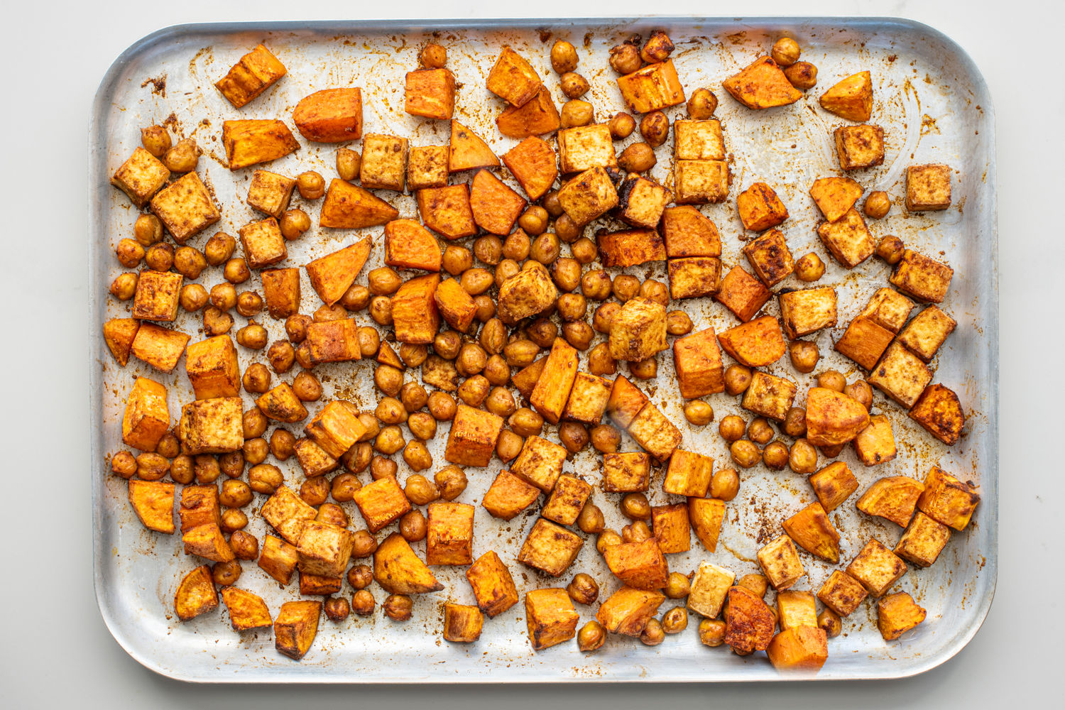 Tofu, Sweet Potato, and Chickpea Traybake with Za’atar Tahini Yoghurt