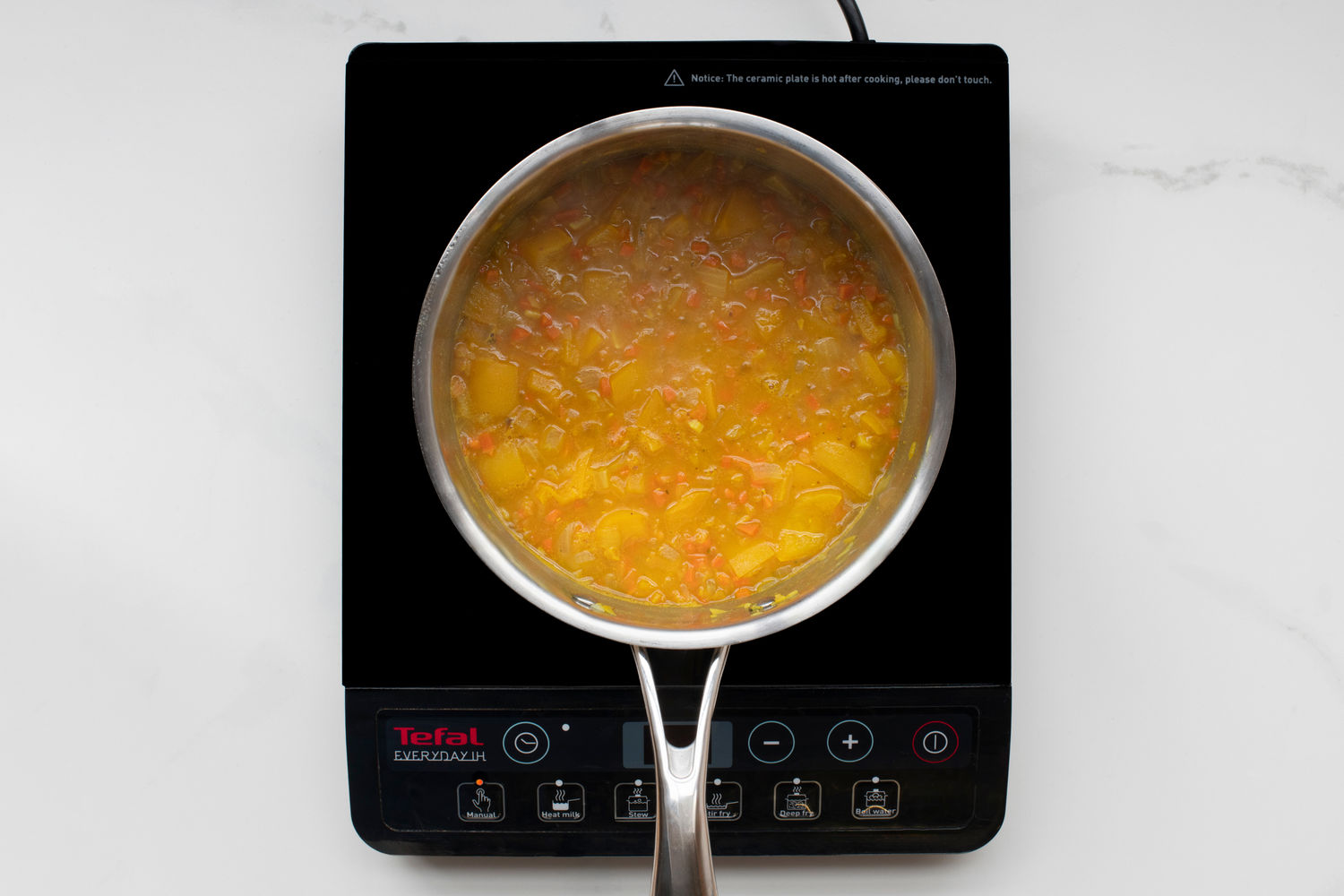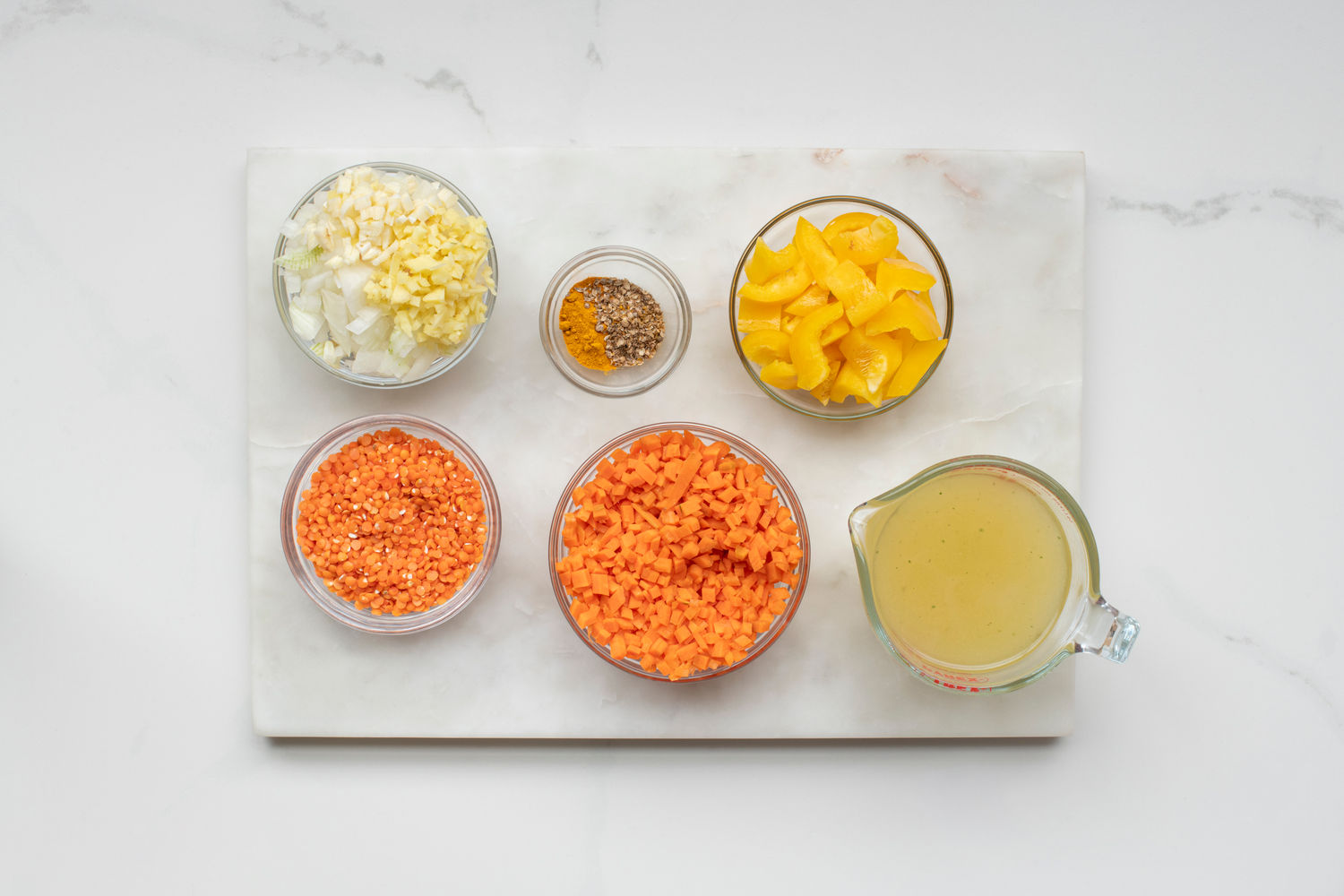 Add the lentils, carrot, and yellow pepper, stirring to coat in the spices. Add the vegetable stock and bring to a simmer. Cook for about 15 minutes, until the vegetables and lentils are soft.
