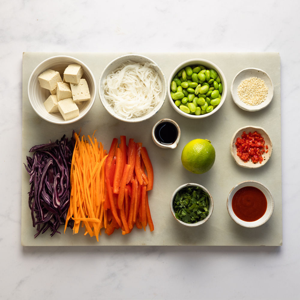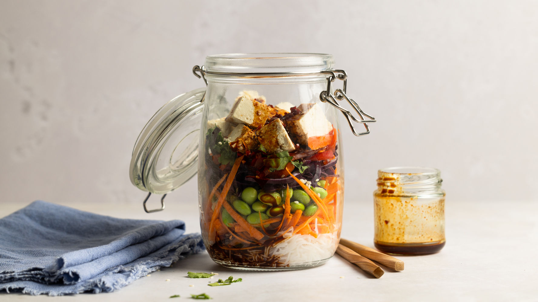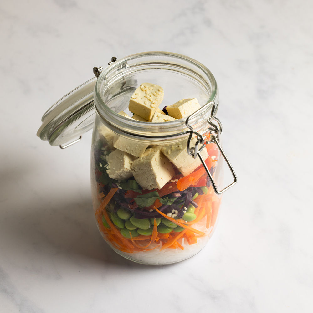 Grab your jar and add the noodles, carrot, edamame, red cabbage, red pepper, coriander, tofu, and sesame. Pour your dressing over the top. we used a 1L jar